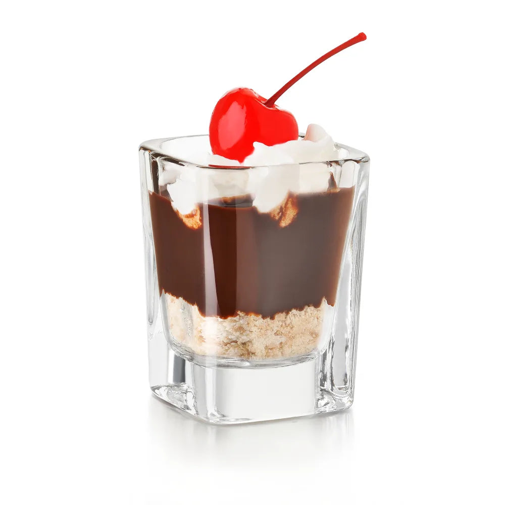 The Libbey 5277 Prism® shot glass has a total capacity of 2 ounces—enough to accommodate a standard 1.5-ounce shot of bourbon, vodka, or tequila comfortably without spilling. This glass's thick base balances the weight of the drink to resist tipping. The glass is clear, so users can see its contents, ensuring the correct beverage is served to the customer. Its square shape fits securely in the user's hand and resists slippage.